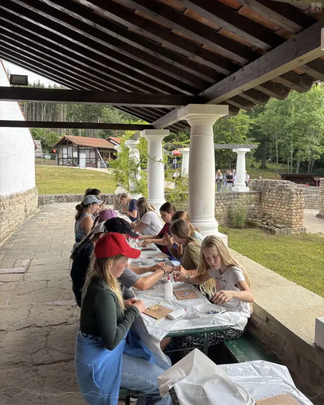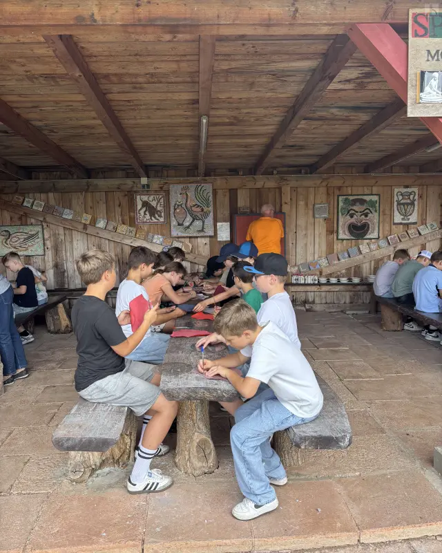 Auch eine Bastelaktion in Form von Mosaiklegen oder des Anfertigen eines römischen Mühlespiels aus einem Stück Leder, welche die Schüler als Andenken an den Besuch mit nach Hause nehmen durften, machte den beiden Klassen große Freude.