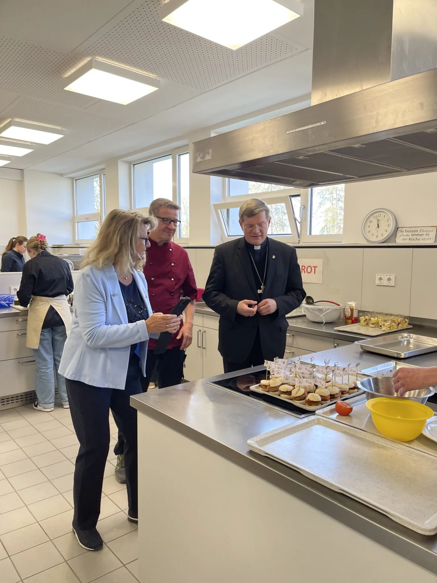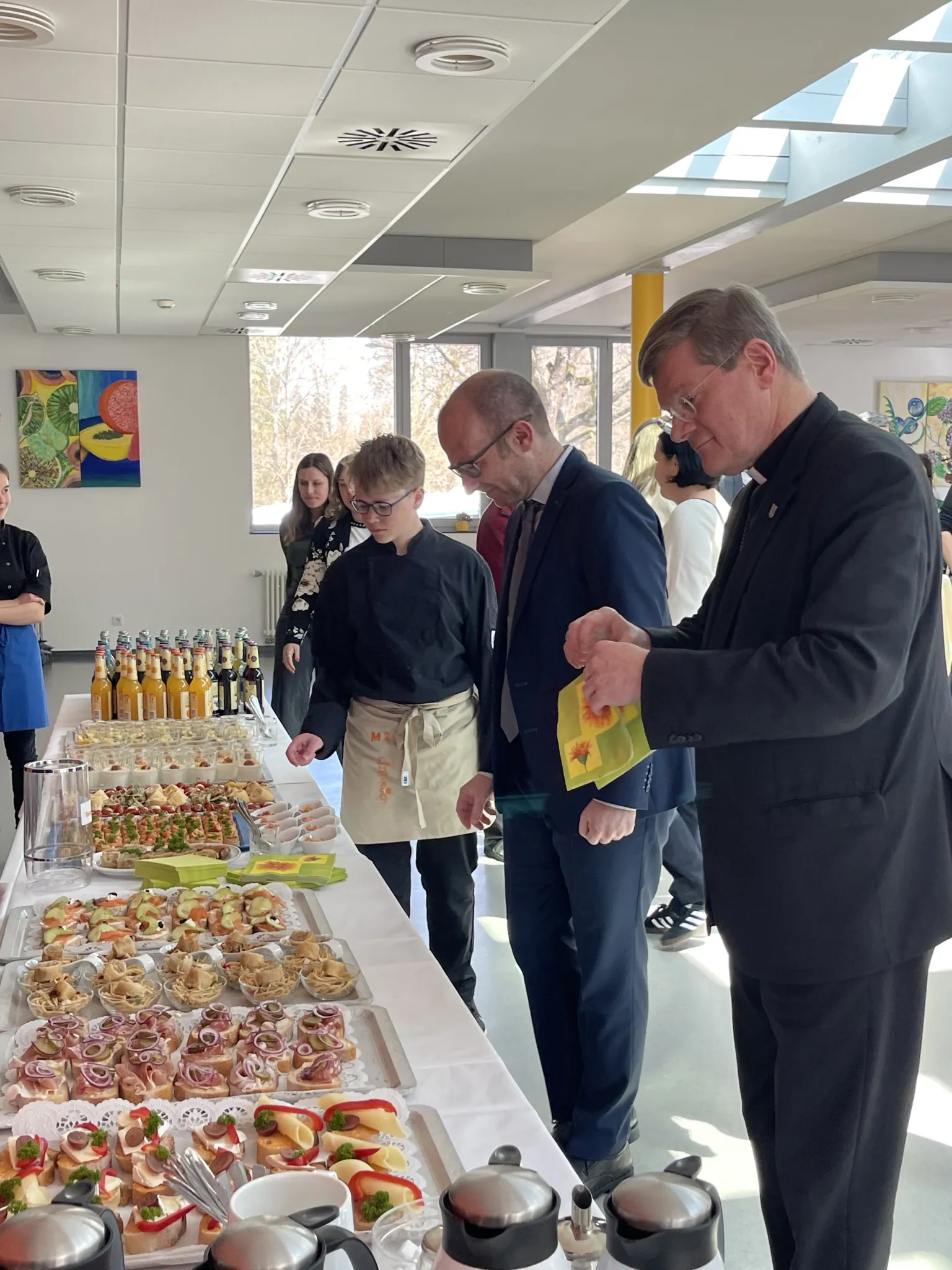 Den LIZE-Köchen war es eine Freude und Bedürfnis, dem hohen Besuch aus Freiburg, neben dem Erzbischof Burger war ja auch der Stiftungsdirektor Herr Krug gekommen, ihre außerschulischen Fähigkeiten zu zeigen. Viele freiwillige Schüler/innen aus allen Modulen werkelten stundenlang in der Schulküche und zauberten ein abwechslungsreiches Fingerfood Buffet. Beide, der Erzbischof und der Stiftungsdirektor nahmen sich eine Dreiviertelstunde Zeit, sich alles über das außergewöhnliche Ausbildungsmodell an der Liebfrauenschule erklären zu lassen.